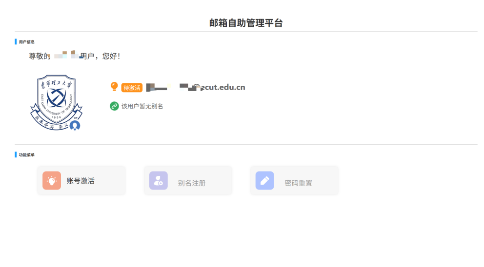 1.邮件系统初始生成一个以校园卡号为名称的邮箱账号(用于与东华理工办事大厅进行身份绑定),初始账号与注册别名的邮箱名,两个名称指向同一个邮箱。用户可以登录邮件系统,在“设置/账户/账号管理”修改默认发件邮箱。